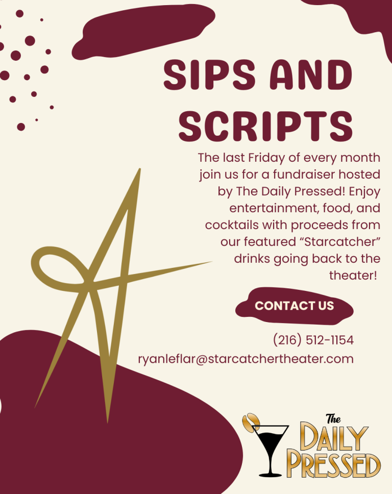 Hosted by The Daily Pressed, our community event, Sips & Scripts, invites local artists to showcase themselves. Signup to provide an act here! For more information reach out to ryanleflar@starcatchertheater.com